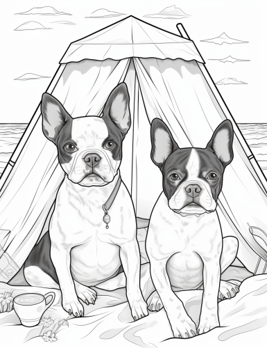2 cute boston terrier's who are in beach tent at the beach, continuous line, no color, thick lines, no shadow, no shading, no grayscale, no fills, white background, niji 5 default, low detail, flat, binary --ar 85:110 --v 5.2