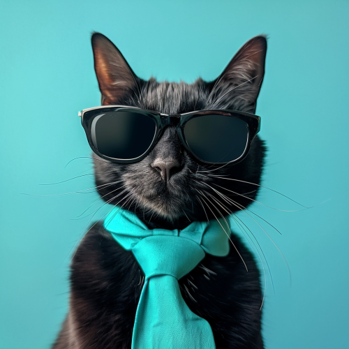 a black cat with spy sunglasses in the style of men in black and a turquoise tie