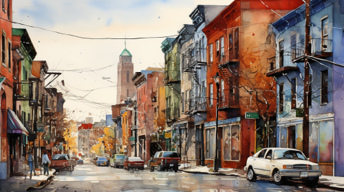 water color painting of Boston's north end, spalshes of color, detailed --ar 16:9