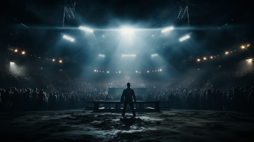 wide view of a boxing ring, with lots of audience in the arena. There is a big youtube logo block behind the boxing ring. Cinematic, symmetrical, centre framing --ar 16:9