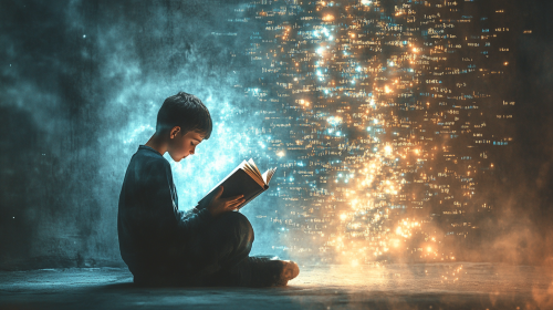 a boy sitting in a reading setting with all the wisdom of the world flowing into his mind. the wisdom is represented in different languages and as numbers and text. Interior scene with a dynamically balanced compostion of a higher education-inspired literacy center in New Mexico, with an emphasis on how literacy opens doors to new opportunities. The design is modern yet warm, featuring earthy tones, wooden shelves lined with books, and large windows that fill the space with natural light. Floating letters, numbers, and subtle educational symbols gently move around the room centralized over a stairway made of books that leads to the open door of opportunity, the door opens into a bright environment evoking a sense of intellectual growth without being overly fantastical. Doorways, arches, or pathways leading from bookshelves symbolize the idea that reading unlocks new journeys. The five pillars of literacy--phonemic awareness, phonics, fluency, vocabulary, and comprehension--are reflected through thoughtful design choices, such as study areas and quiet reading nooks. The atmosphere is inspiring and inviting, filled with the energy of discovery while maintaining a grounded, academic feel. in the style of the reading rainbow --aspect 16:9