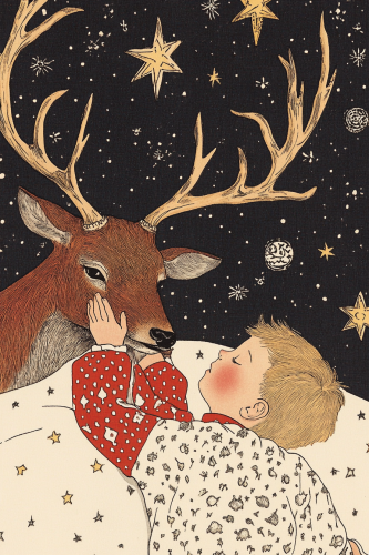 Boy and deer sleep under starry sky
