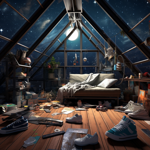 bungalow attic. Slanted walls. White walls. one exterior window. VIEW: interior glass doors onto office with couch. Tags: big desk, mcm couch, small space, attic, retro --v 5.2