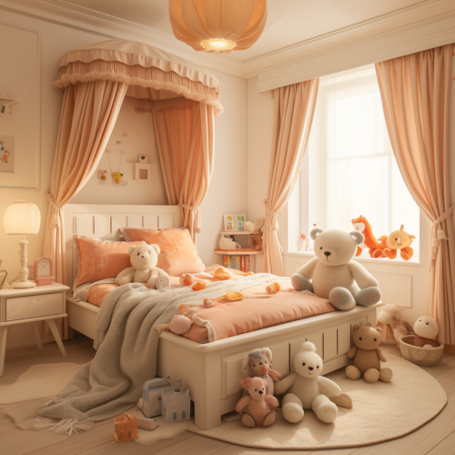 hyper-realistic little girl's bedroom with a traditional double bed and all the colors in the room in cream, pale pink and pale orange, with a window and tall velvet-colored curtains, and a few matching baskets filled with stuffed animals
