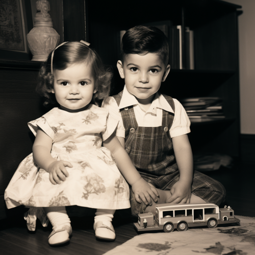 cartoon illustration of a Polaroid image of a young tan Italian man with blue eyes, freckles, black leather jacket nico tortorella facial features, black pompadour hair cuddling a male toddler with black hair, green eyes, wearing dungarees