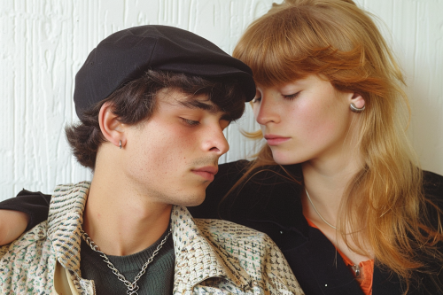 realistic high quality photo of an argentinian boy with black short curly hair, wearing a black baseball cap and a beige trenchcoat, he also is wearing silver chains. He is looking lovingly at a girl, sitting besides her, the girl has long orange-blond hair, and a black shirt, she is with her eyes closed. light Grey color palette, with a vintage film camera feel, soft light, serene and nostalgic mood --sref 1109890837 --style raw --ar 3:2 --v 6.0 --s 250