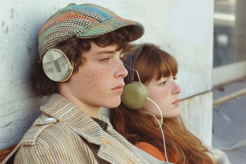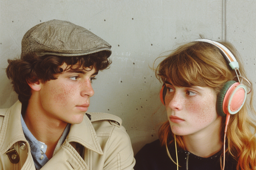 realistic high quality photo of a boy with dark short curly hair, wearing a cap, he is wearing a beige trenchcoat, he is looking at a girl sitting besides a her, the girl has long orange-blond hair, headphones, and a band black shirt, she is looking away. light Grey color palette, with a vintage film camera feel, soft light, serene and nostalgic mood --sref 1109890837 --style raw --ar 3:2 --v 6.0 --s 250