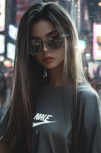 A beautiful girl with long hair wearing sunglasses and Nike sneakers, Mobius anime, She has dark, straight, shoulder-length brownish-brown hair and is wearing a grey shirt., surreal, futuristic, central, HDR, ray tracing, neon aesthetics, Toby Brooks --ar 2:3 --v 6.1
