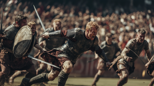 paul scholes mid-tackle in a football game for manchester united. the stadium is full. all footballers are wearing light medieval styled armour and carrying various melee weapons. photograph. HD. realistic. real life. --ar 16:9