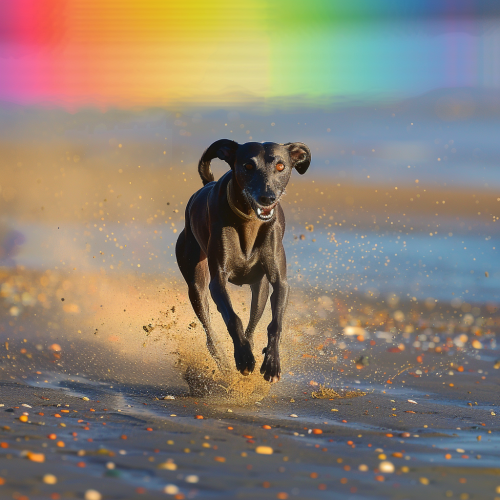 Black greyhound dog, running on the beach, rainbow, high contrast, 8k, - - ar 9:16