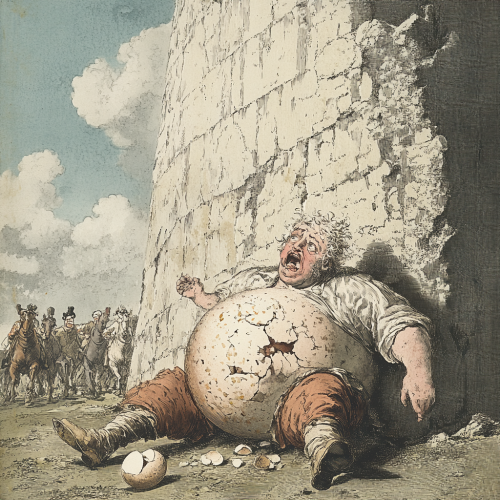 An 18th-century engraving-style illustration of Mister Nimbus and Humpty Dumpty after their great fall. Both lie on the ground beneath a large, towering stone wall, looking distraught. Mister Nimbus, the youthful god of clouds, with short cropped hair, a neatly trimmed beard, and a muscular cloud-like physique, is splattered with cracked egg and broken shells from Humpty Dumpty. Humpty Dumpty, cracked and shattered, lies in a pool of yolk beside him. The scene is filled with intricate crosshatching, fine details on their expressions of shock and despair, and the dramatic texture of the cracked wall behind them. Horses and men rush toward them in the background. --ar 1:1