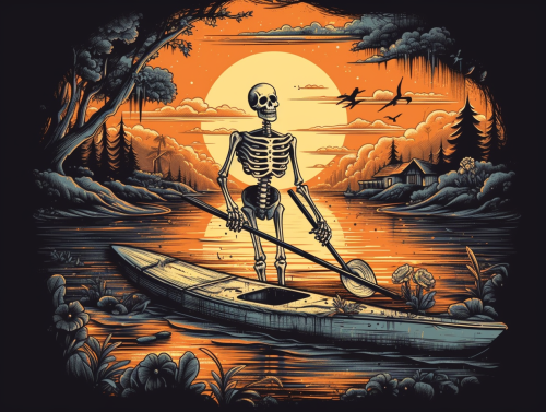 A vintage 1980s rock and metal t-shirt design featuring a skeleton riding a paddleboard on a tranquil lake during a dramatic sunset. The skeleton, with a wild grin on its skull, wears aviator sunglasses and a tattered bandana, while standing firmly on the paddleboard with one hand gripping a paddle and the other raising a rock ‘n’ roll hand gesture. It has a guitar strapped to its back, and the paddleboard leaves a subtle wake across the water, adding a sense of motion to the scene. The sunset casts an intense glow of oranges, purples, and pinks, reflecting vibrantly off the calm lake surface. The art style is a retro screen-print with thick black outlines and bold, neon colors typical of 1980s rock band merchandise. The skeleton is drawn with sharp, dynamic lines, and the colors are slightly faded, as if from years of washing. The background features rugged mountains and silhouettes of pine trees on the horizon, with electric streaks and flames around the edges to give it a fierce and rebellious vibe. The lighting is a vivid blend of sunset colors, with beams of gold, pink, and purple highlighting the skeleton’s bones and the reflective surface of the water. Shadows are long and dramatic, enhancing the contrast between the darkened water and the glowing sky. --ar 4:3 --s 275 --v 5.0