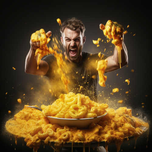 photos for high-energy magazine ads encouraging people to eat mac n cheese with their fingers. Photos shoud show a full torso of a very excited person, with sloppy mac n cheese all over their hands and clothes