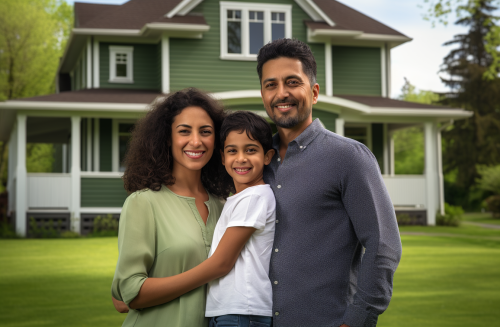A young beautiful model Indian family of three stands in front of their new indian house, smiling and looking at the camera. The son is holding his mother's hand while she has her arm around him. They stand on the lawn with green grass and trees behind them. In the background you can see an elegant two-story cottage-style home with white walls and dark windows.mother wearing traditonal dress , It’s sunny outside, and there’s blue sky above. The scene depicts a happy family in front of their new home, in the style of a traditional Indian painter.Color Grading, Editorial Photography,natural light,Ray Tracing Reflections, Lumen Reflections, Screen Space Reflections,he image, captured in stunning Ultra HD, Nikon D850 Diffraction Grading, cinematic lighting, extreme realismChromatic Aberration, --v 5.2 --ar 32:21