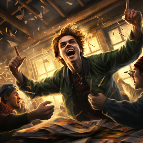 In the protagonist’s imagination, a group of rugged farmers stands around an old, dimly lit barn. They are holding weapons and bundles of drugs, laughing and celebrating. Their faces are hard and rough, dressed in old flannel shirts and dirty jeans. In the background, bales of hay and old farm equipment are barely visible in the shadows. The atmosphere is tense and gritty, with a dark, sinister edge to the celebration, as if something dangerous and illegal is taking place. --v 6.1 --ar 16:9