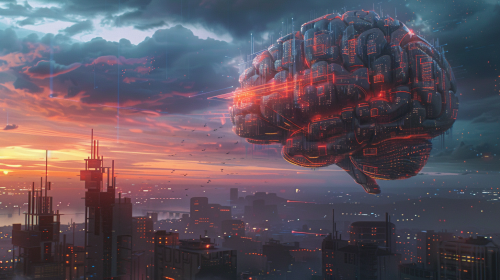 A hyper-detailed digital painting of a massive AI brain suspended in the sky, glowing with complex circuits, constructing futuristic real estate developments below. Buildings rise from holographic blueprints, while data streams from the AI's circuits shape the cityscape. Created Using: futuristic realism, hd holographic projections, sharp lighting contrasts, data visualization elements, ultra-modern architecture, hd quality --ar 16:9 --v 6.0