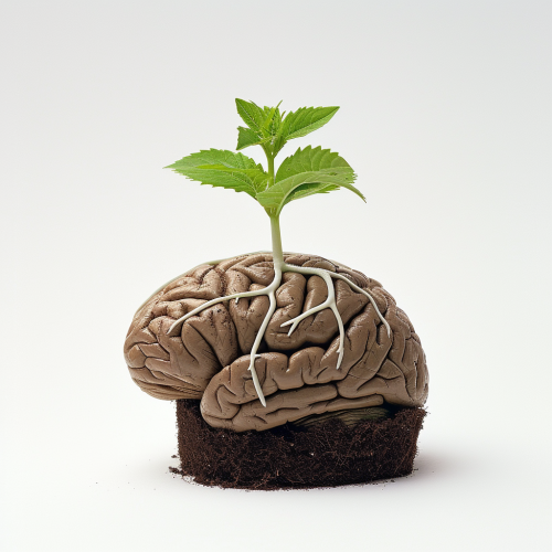 A human brain, with a small plant growing from it, there is some dark soil at the base of the plant, the leaves look like neurons, some small white flowers, bright lighting, isolated, 50 mm, advertising photography, white background, view frontal --v 6.0