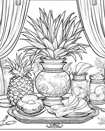 Create a black and white coloring page illustration of an arrangement of Hawaiian Proteas and Pineapples in a Chinese ceramic urn shaped vase. The vase sits on a beautiful Victorian style display table in a drawing room. There is a plate of cut slices of pineapple rings arranged neatly on the tray. There are napkins and small plates and a serving spatula. There are sea shells in fancy glass jars next to the vases arrangement. There are drapes in the background with various Victorian style furnishings. The lines are thick and no shading or shadows on this illustration. This is black line drawing on white paper. --ar 4:5 --v 6.1