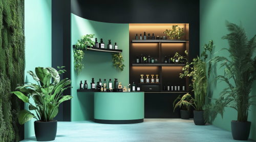 Design of a stand for a perfume brand, in minty green and black colors, with a display stand and wall. The decoration features plants and chess pieces. The shelf is filled with perfume bottles. The stand is designed in a modern style, in a modern event space. The rendering is realistic, with warm lighting, a wide shot and hyper-realistic, highly detailed, high-resolution quality. --ar 128:71