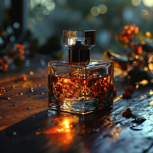 Create a promotion card of a luxury perfume , dimensions 3.5*2 inches. The design should be elegant and high-end, featuring a minimalistic and sleek background with a subtle texture. Place a sophisticated glass perfume bottle in the foreground, showcasing exquisite craftsmanship and intricate details. The bottle should be the focal point and be illuminated by soft, ambient lighting to highlight its luxurious qualities. Use a stylish, modern font to display the brand name and perfume details, conveying a sense of exclusivity and elegance. The color scheme should be a harmonious blend of gold, black, and white, symbolizing opulence and sophistication. --v 6.0 --s 750