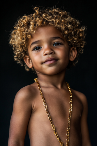 black boy toddler, professional photo, muscular male toddler, curly hair, 5 years old African boy, freckles on the face and body, dark skin with blonde hair, kid from slums, rough skin features with musculine face, dumb face, brazilian features, fashion for toddlers vibe, golden chain, modern clothing --ar 2:3 --style raw --s 50