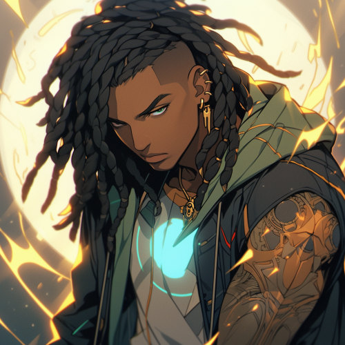Adopt, adoptable character, male, Brazilian-looking, hot looking dark-skinned young man with dark dreadlocks, golden sunny eyes and big lips, charismatic, superpower of sun rays and sunlight, concept art, dynamic posing, detailed concept art, cinematic lightning, cyberpunk, neopunk, futurepunk, --niji 5 --stylize 500