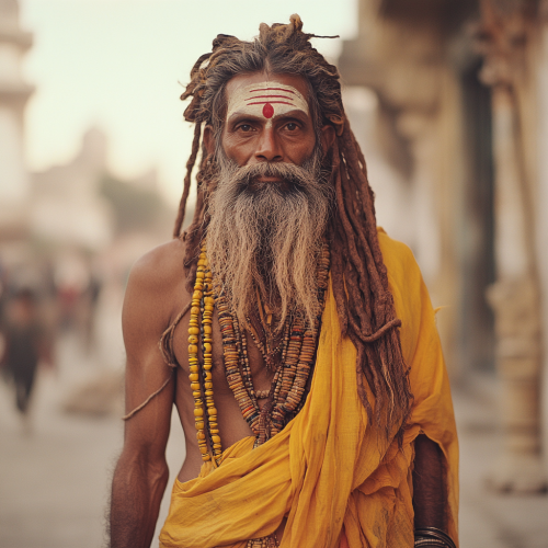 An indian sadhu wearing saffron dhoti with long dreadlocks, photography, photos by sony camera, photos by canon camera, 50mm, high resolution, sharp, highly intricate --v 6.1