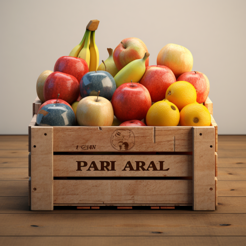 pixar style, one box full of fruits, wood, small box, front view,3D render, hyper realistic, cinematography ~~ar4:5