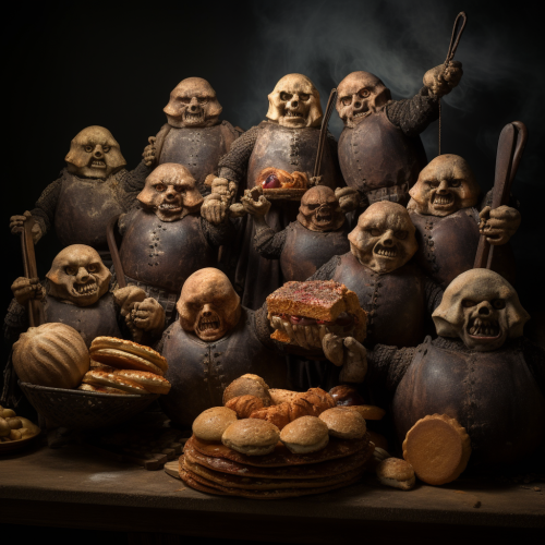 giants breads army in devilcostume, bad head, coocking tools in back ground, dark back ground, realistic