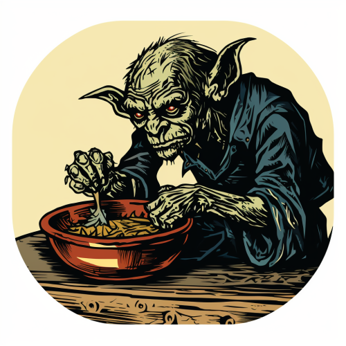 goblin eating cereal out of a bowl, three color, style of medieval woodcut --style raw