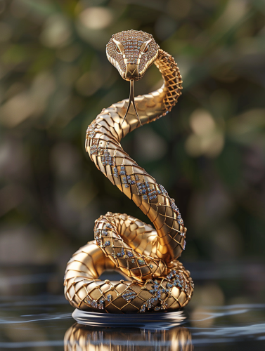 front view, golden snake statue, large details, gems, incredeble design. front view. exclusive. Expensive. shiny. modern design. realistic materials. attention to detail. realism. --ar 3:4 --v 6.0