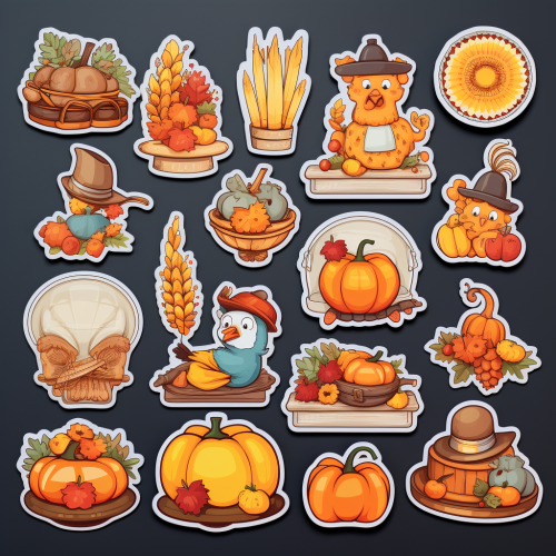 a collection of 16 cute thanksgiving related stickers, table, turkey, wreath, rake, etc.