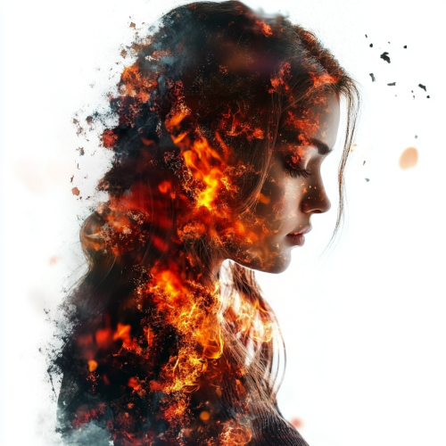 Beautiful young woman with a wild love and a misunderstood fire, which consumes hearts without rules or chains, leaving behind ashes of passion and sparks of freedom, with a white background and in high resolution