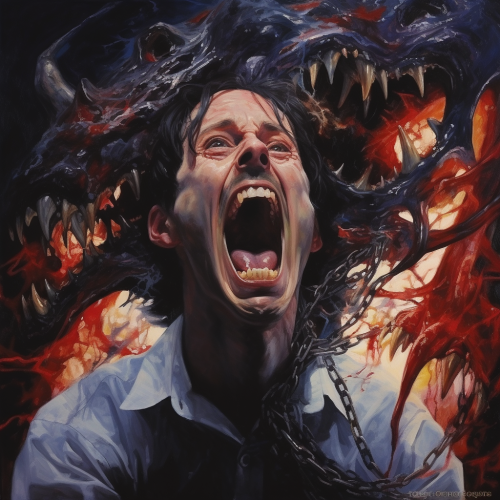 Ripped shirt Muscular man breaking free from alter ego, his ghost fading into the background in partial transparency. Broken chains wildly tossed to the side as darkness turns in the background