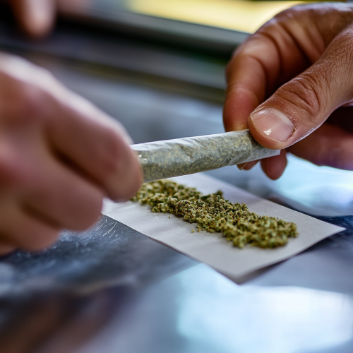skillfully rolling a cannabis joint. Finely ground cannabis is evenly spread across a rolling paper. The thumbs and index fingers carefully shape and roll the paper into a perfect cylindrical joint, with a filter tip at one end. The joint is sealed by gently licking the adhesive strip and finalizing the roll. Focus on the hands, paper, and cannabis with realistic detail, showcasing the proper rolling technique