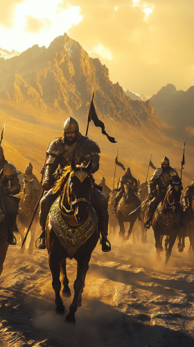 Mahmud of Ghazni leading his army across vast plains, with towering mountains in the background, golden light reflecting off their armor, surreal, hyper-realistic, Ultra HD --ar 9:16