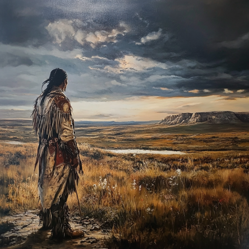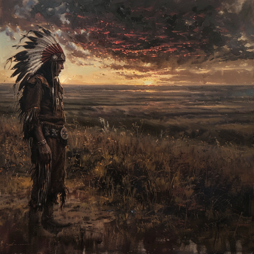 ultra realistic oil painting, fine art, a native american warrior stands alone on the great plains after battle, isolation, majestic landscape, natural light--ar 2:3 --v 6.0