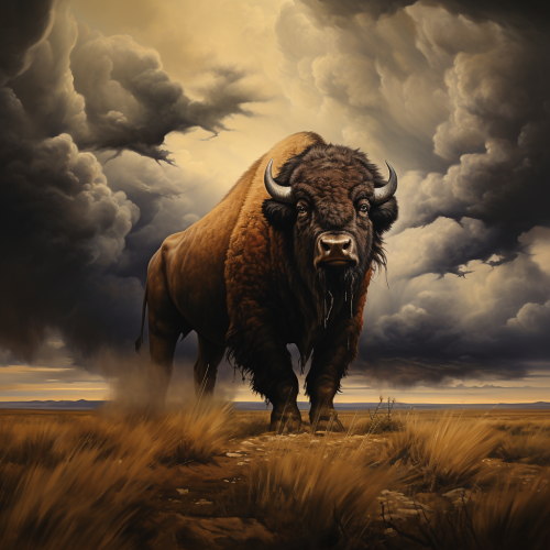 painting in the style of Bill Anton of an American buffalo on the open plains with a large thunderstorm rolling in the distance