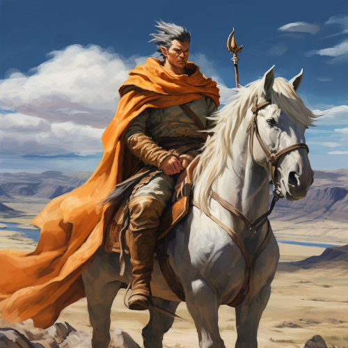 goku, commanche, DnD monk, no armor, cowl, ju jitsu ghee, photorealistic, horseback across plains, seen in profile