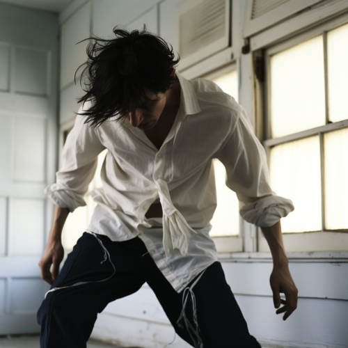 guy in pain, viscously rolling across the room, swinging arms and legs in every direction, breaking bones, in a white dress shirt and black pants, with black shaggy hair, photograph, clean