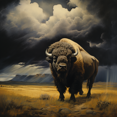 impressionist painting of an American buffalo on the open plains with a large thunderstorm rolling in the distance, style of Remington