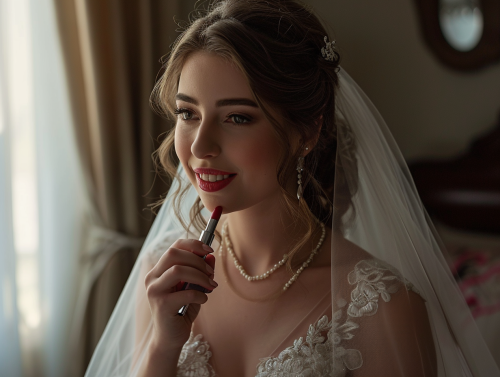A bride getting ready for her wedding ceremony, holding a lipstick in her hand, smiling gently. The scene is captured with the quality and style of a CANON EOS camera, showcasing vivid colors and fine details, reflecting natural lighting in a softly lit room, with elegant wedding attire and makeup accessories around --v 6.0 --ar 4:3