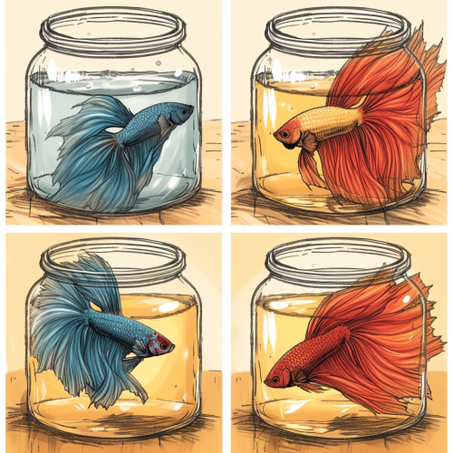 a 4-pane comic about 2 betta fish in love with text --v 6.0 --chaos 100 --weird 3000