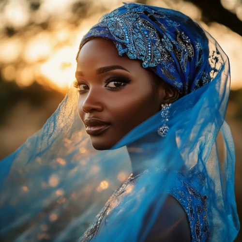 beautiful black bride in Botswana, she is wearing a blue printed fabric with intricate detailing and embellishments and blue veil, in the bush modern, the image should be relevant to location, almost sunset , regal shot