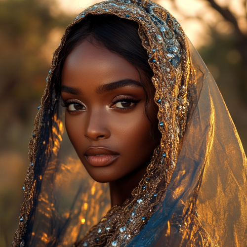 beautiful black bride in Botswana, she is wearing a brown printed fabric with intricate detailing and embellishments and blue veil, in the bush modern, the image should be relevant to location, almost sunset , regal shot