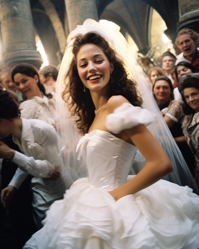 medium format shot of a young beautiful model bride looking joyful with a striking gaze while dancing surrounded by the crowd shot by Bruce Weber, italian aesthetic wedding --ar 4:5