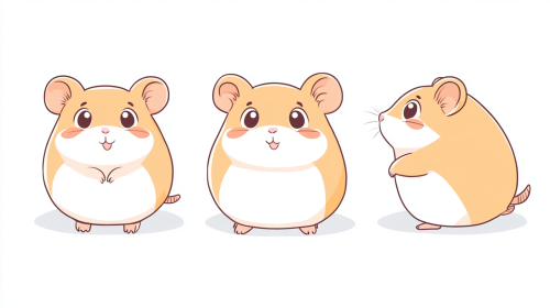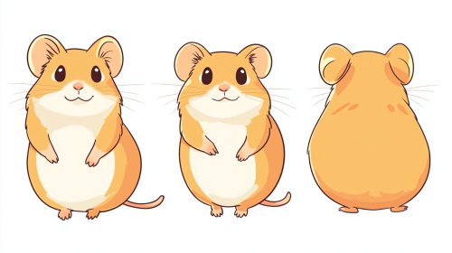 A simple and cute illustration of a hamster with bold, clear outlines, showing three different views: front, side, and back. The hamster has round cheeks, small ears, and bright, expressive eyes. Its fur is fluffy with distinct patterns in shades of brown and white. The front view shows the hamster standing upright with a friendly expression, the side view shows the hamster in a playful pose as if sniffing around, and the back view displays its small, round tail and furry back. The colors are vibrant and rich, with strong contrasts to make the features stand out. The overall style is minimalistic and cartoon-like, focusing on clear shapes and lines with a simple, white background. --ar 16:9 --v 6.1