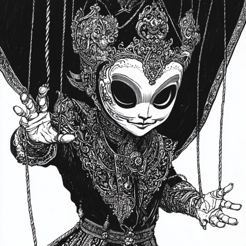 Create an illustration in the style of Edward Gorey, depicting a mysterious puppet-like figure inspired by traditional Southeast Asian shadow puppetry. Use meticulous cross-hatching and fine, intricate linework to capture every detail of the ornate mask and embroidered costume. Ensure the figure has a simple, stylized silhouette with slightly exaggerated proportions. Keep the facial expression emotionless, hinting at a strange detachment or eerie calm. The background should be minimal, emphasizing negative space to convey a sense of emptiness or suspense. Include symbolic elements subtly, such as abstracted swirls, suggesting movement or a hidden narrative. Focus on contrast, using dark shadows and fine lines to evoke texture and depth.