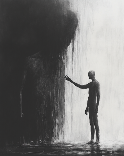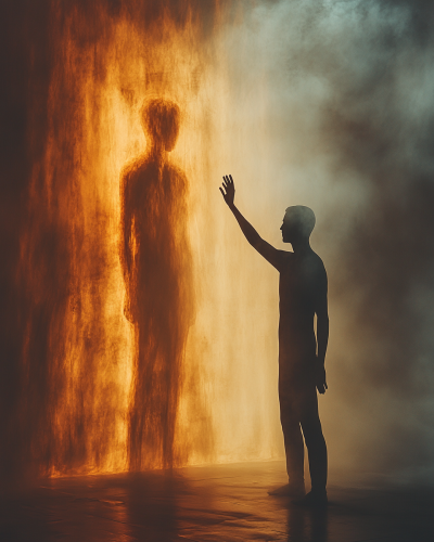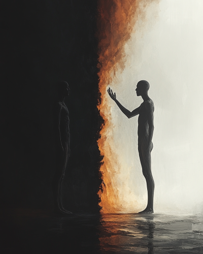 A man standing with his hand raised at chest level, facing a silhouette of himself standing in the same position on the opposite side. The scene symbolizes the idea 'the ego seeks to divide and separate, while the spirit seeks to unify and heal.' The man and his silhouette are on opposite sides, with a subtle dividing line between them, representing the separation caused by ego. A soft light connects their raised hands, symbolizing the unifying and healing power of the spirit. The atmosphere is contemplative, with contrasting light and shadow to emphasize the duality, Karmazid art --ar 4:5 --s 750