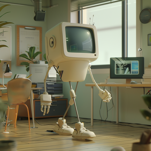 a computer with legs, walking into an office in the morning, using a clean 2D illustrated style